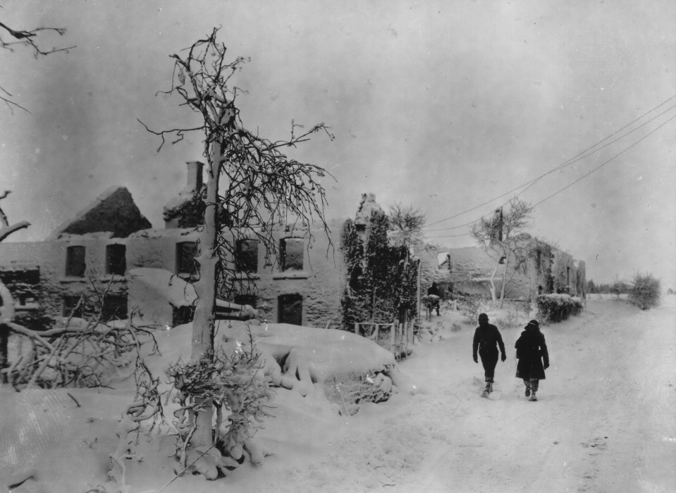 Two 90th ID soldiers check for damaged telephone lines at wartorn Benonchamps, Belgium, east of Bastogne - January 20, 1945. (U.S. Army Signal Corps Photo, Courtesy National Archives)