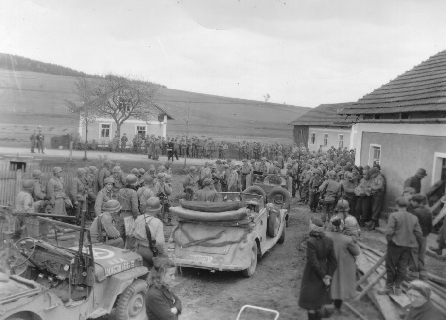 90th Infantry Division soldiers await the surrender of German General Wend Von Wietersheim and his 11th Panzer Division near Vseruby, Czechoslovakia - May 1945. (U.S. Army Signal Corps Photo, Courtesy National Archives)