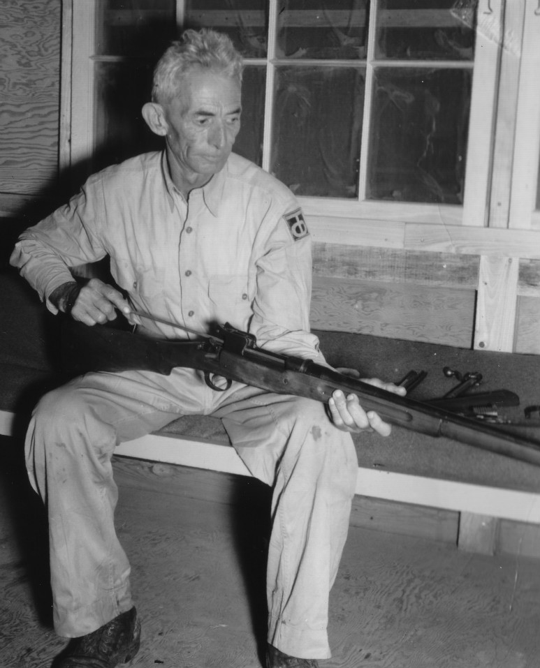 Good morning to all!  Monday morning means 90th Infantry Division Pic of the Week.  This shot comes to us from Camp Barkeley, Texas, where the 90th Infantry Division trained prior to their departure overseas.  Private Lew Blakeslee, from Cuero, Texas, served with the 315th Engineers, 90th Infantry Division in World War I.  Here he is at Camp Barkeley with his old unit, cleaning his rifle, getting ready for World War II.  I’d love to hear more on this guy.  I wonder if he ever made it overseas.