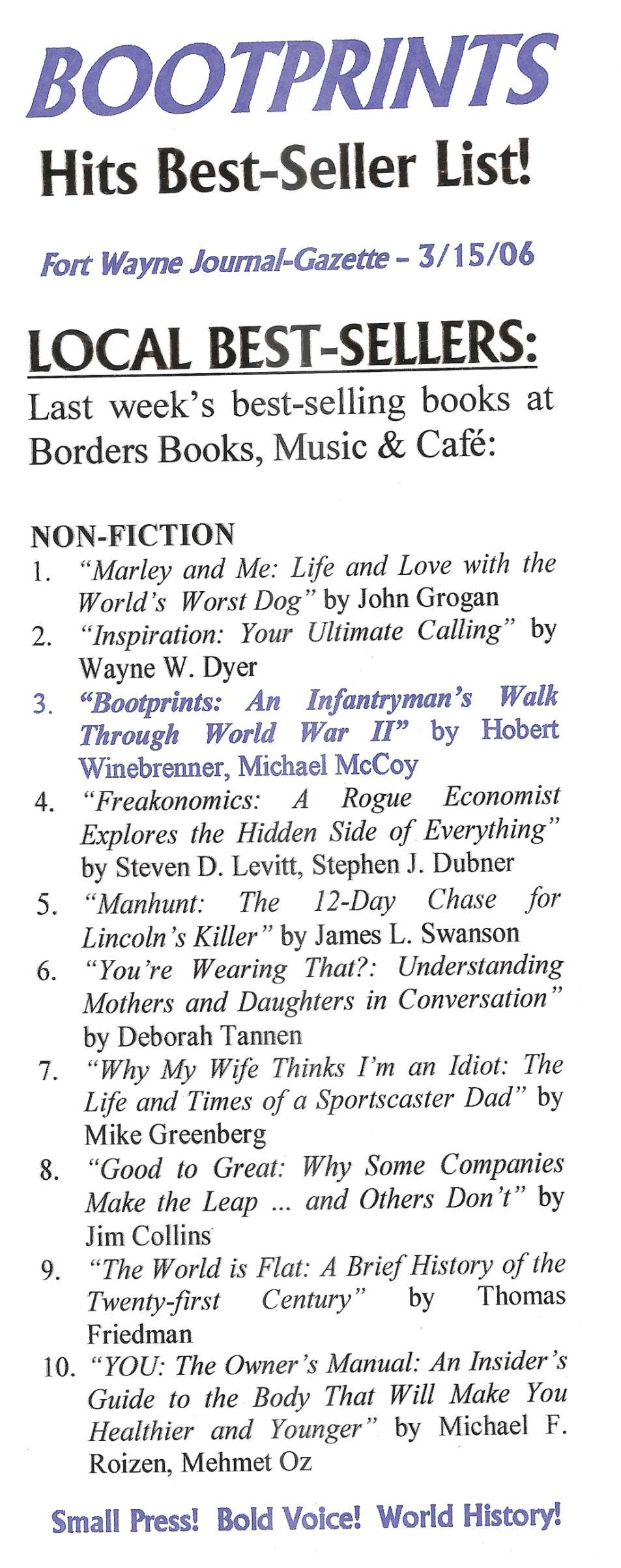 On a good note, the History Junkie was very pleased to see that his Borders Store of choice in Fort Wayne, Indiana is not on the list of 200 that will close. This store has always been very good to me. Back when BOOTPRINTS first came out, the Fort Wayne staff agreed to take a chance on a first-time author and allowed a generous location for a point-of-purchase display. I think I can safely say the arrangement was mutually beneficial as BOOTPRINTS quickly climbed their best-seller list. Damn Marley and Me. Hobert Winebrenner and I also did a book signing at the store. Ahh, great memories!