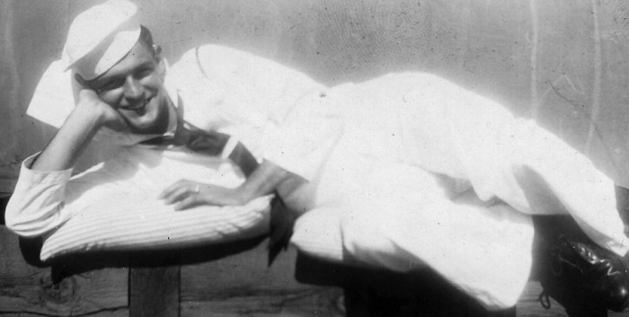 “An English minesweeper saw me and threw me a ring. They pulled me over, but I couldn’t lift myself out of the water. …Two guys came down that rope ladder and just pinched me between them and up we went. They stripped all my clothes off because they were covered in oil. They put me on the deck over the engine room where it was warm. …The explosion cracked the fifth vertebrae in my back, put a little scar under my eye and knocked a couple of my bottom teeth out. But, I was alive.”