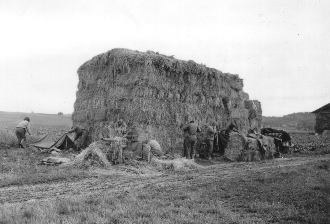 Members of the 3rd Battalion, 358th Infantry, 90th Infantry Division, attempt to conceal a 57mm anti-tank gun in an over-sized haystack, somewhere along the French countryside - August 31, 1944. (U.S. Army Signal Corps Photo, Courtesy National Archives)