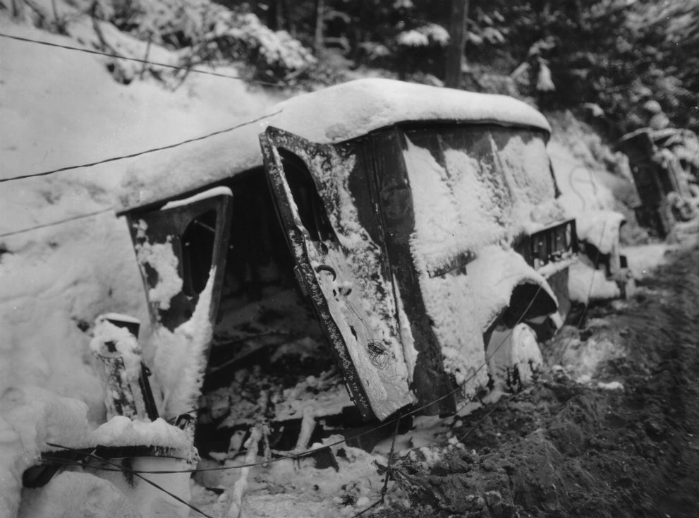 An American ambulance, destroyed by Nazi fire during the Battle of the Bulge, flanks a roadside near Longvilly, Belgium, on the outskirts of Bastogne - January 1945. (U.S. Army Signal Corps Photo, Courtesy National Archives)