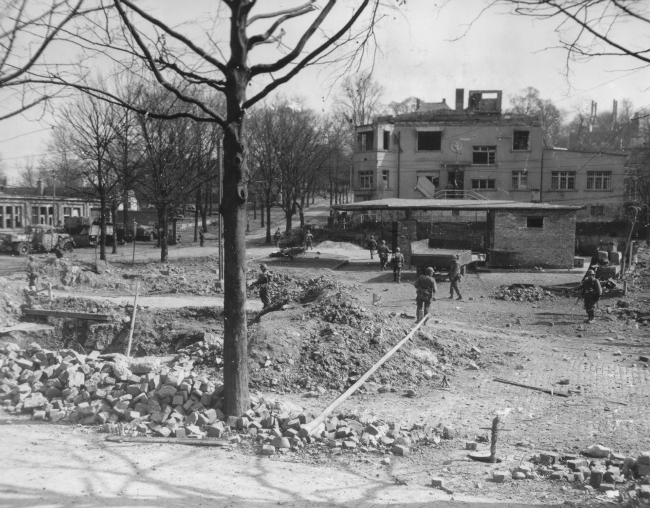 Soldiers of the 2nd Battalion, 358th Infantry, 90th Infantry Division, advance through the rubble-strewn streets of Mainz, Germany - March 1945. (U.S. Army Signal Corps Photo, Courtesy National Archives)