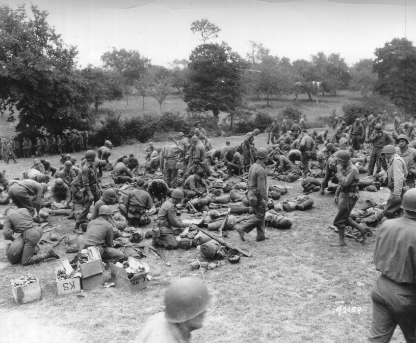 The photo shows newly arrived 90th Infantry Division replacements tearing down their full-field packs for something more manageable for their soon-to-be life on the front lines. The pic was taken near Pretot-Sainte-Suzanne, France in lower Normandy, south of Picauville. One can only imagine what is going through these young soldiers’ heads as they near the battle lines.