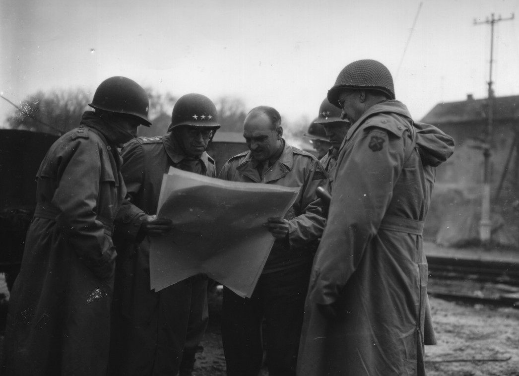 Lt. General Omar Bradley (second from left), CG U.S. 12th Army Group, studies situation maps with commanders of the Third Army, including General George Patton (second from right), during a tour of the Metz Front at Salzburg, Germany - Nov. 1944. (U.S. Army Signal Corps Photo, Courtesy National Archives)