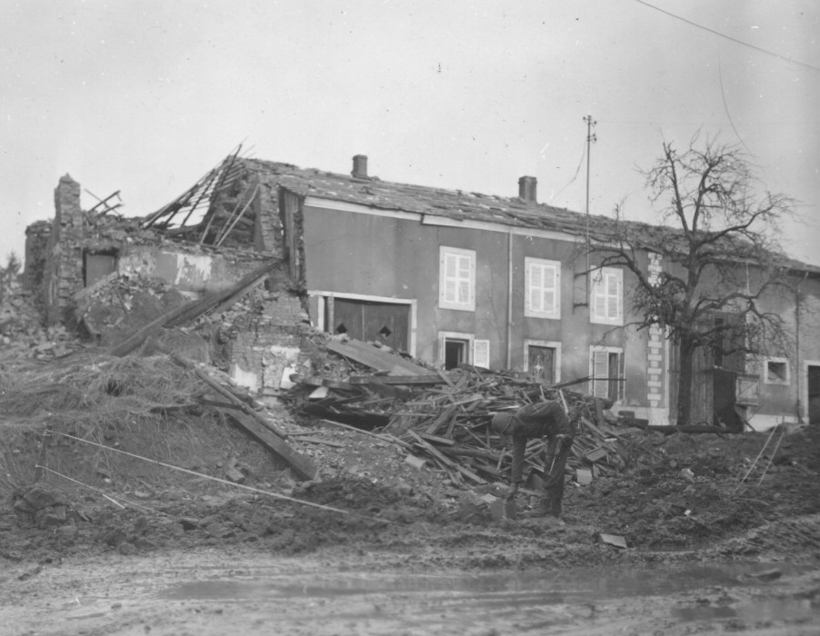 Yank infantryman, 90th Infantry Division trooper, Alphonse Tyska from Pittsfield, Massachusetts, scavenges through rubble for items to build a fire at Silwingen, Germany. (U.S. Army Signal Corps Photo, Courtesy National Archives)