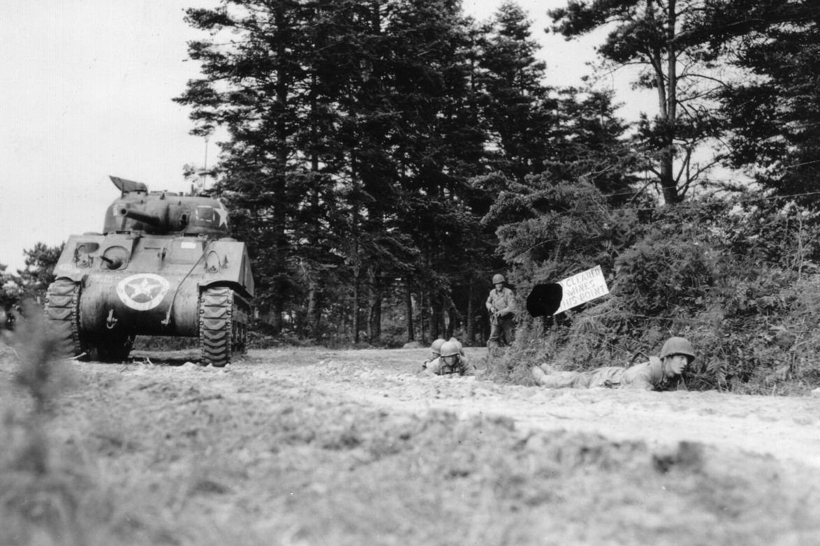 Near St. Jores, France, 90th Division infantrymen inch forward, while flanked by a tank, during the early stages of the push through Normandy - July 1944. (U.S. Army Signal Corps Photo, Courtesy National Archives)