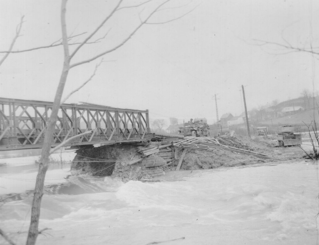 Good morning to all! I hope the weekend was rewarding. Thank you for joining us for the 90th Infantry Division Pic of the Week. You think only the infantrymen had a dangerous occupation? Try building a temporary bridge over the swollen Our River in February 1945.