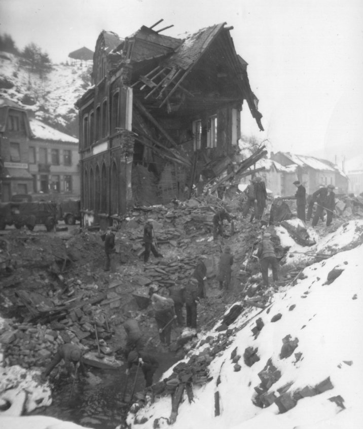Civilians in the town of Troisvierges, Luxembourg begin the clean up of debris after the Germans were pushed out by the 90th Infantry Division in late January 1945. (U.S. Army Signal Corps Photo, Courtesy National Archives)