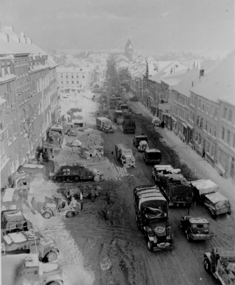 Looking north into Bastogne, Belgium shortly after the liberation of the city during the Battle of the Bulge - January 22, 1945. Note the heavy vehicle traffic. (U.S. Army Signal Corps Photo/Sgt. P.E. Anders, Courtesy National Archives)