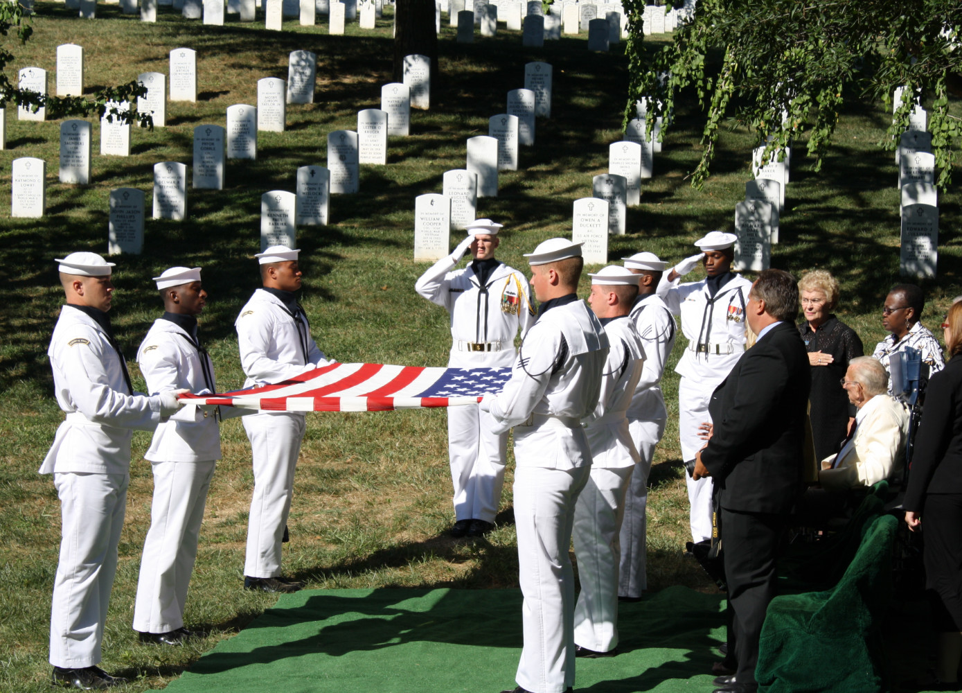 At Arlington National Cemetery, U.S. Navy detail folds American flag honoring John Witte Bogert as his brother, Bob and family look on.
