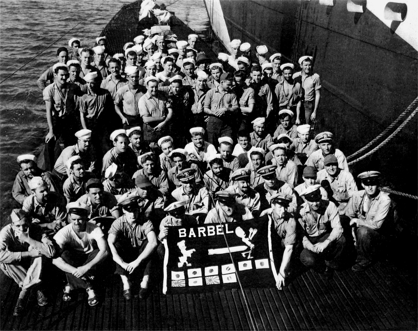 Crew of the USS Barbel sport 10-kill battle flag following third war patrol – October 1944